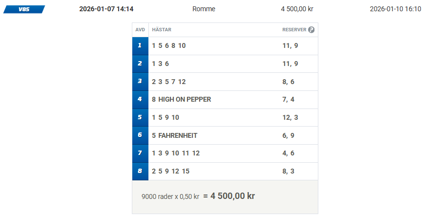 Aktuell spelomgång: V85 Romme lördag 10 januari - med extra stor DrömJackpot på 130 miljoner...
