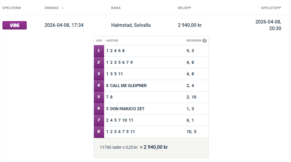 Aktuell spelomgång: V86 Jägersro-Solvalla onsdag 29 april