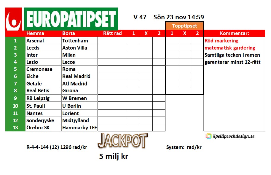 Jackpot söndag på Europatipskupongen med 5 milj kr och en massa spännande matcher att se framemot.