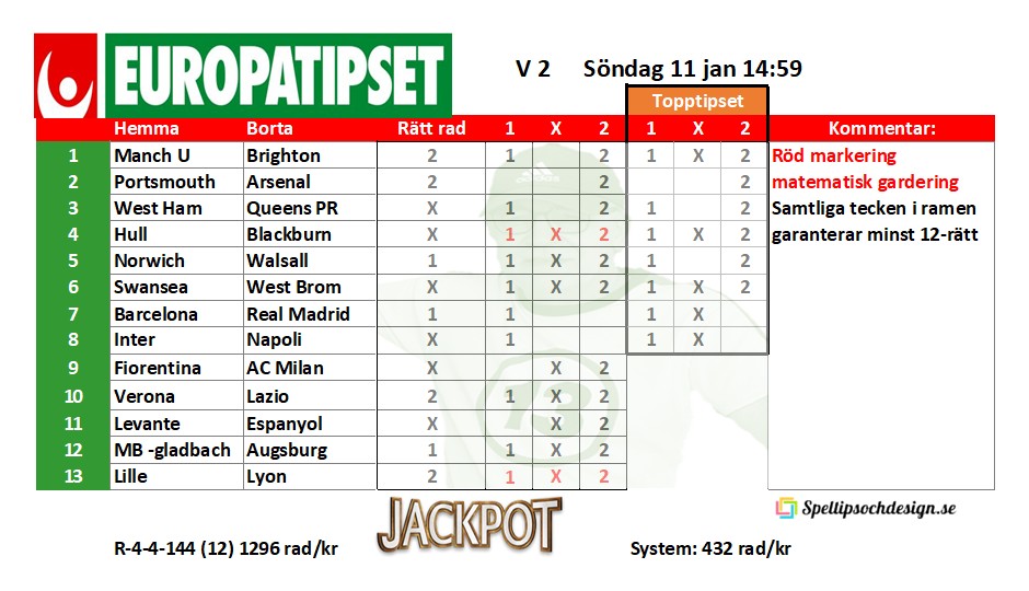 Draget i kuponghögen: 3. West Ham-Queens PR hett derby där Hammers har stora problem. Potter har sparkats och nu hänger Nuno löst och ingen förstår att truppen inte är tillräckligt bra trots vem som leder laget. QPR mår bra och räds inte alls motståndet. 1 2-gardering ger grön bock.