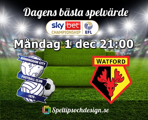 Speltips måndag 1/12 Birmingham City FC-Watford FC