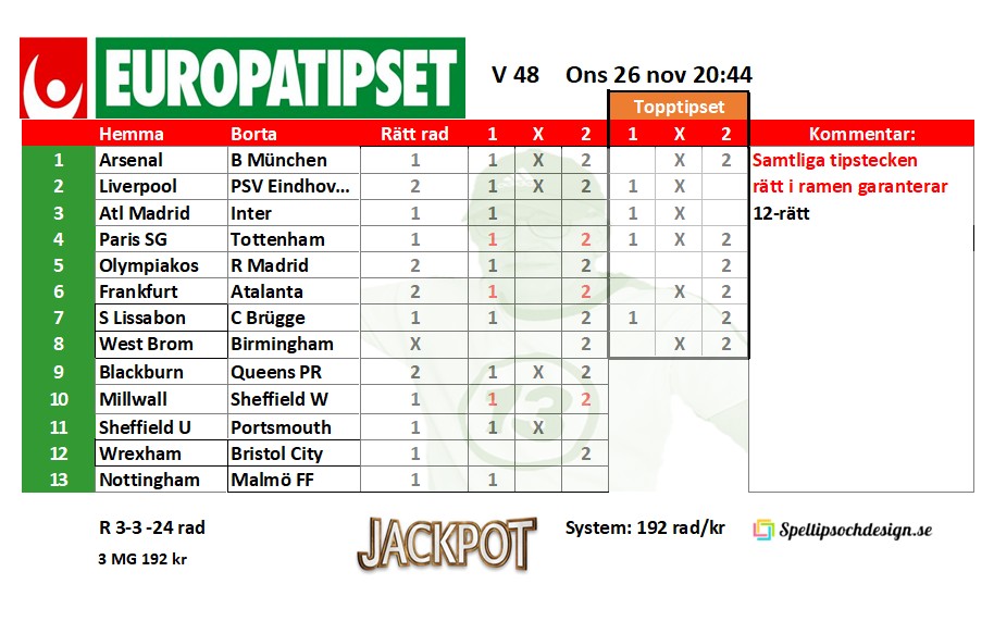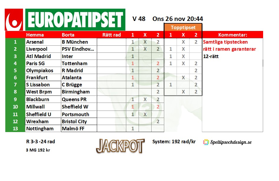 Draget i kuponghögen: 6. Frankfurt-Atalanta vinna eller försvinna i bägge lägren. Italienarna kommer till match med ny tränare vilket självfallet kan ge en tränareffekt. På med kepsen… 1 2-gardering eller en så kallad gubbe-gardering om man så vill.