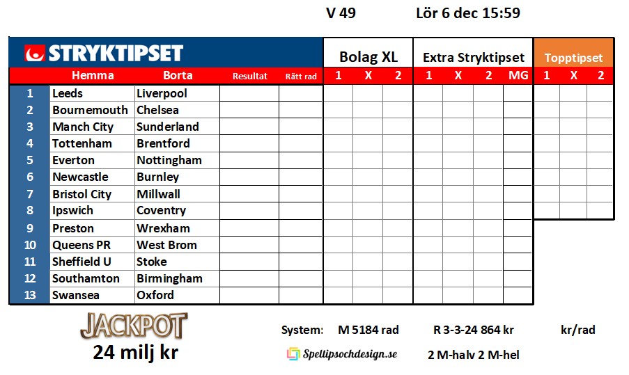 Vecka 49 Spelstopp: lördag 6 dec kl 15:59