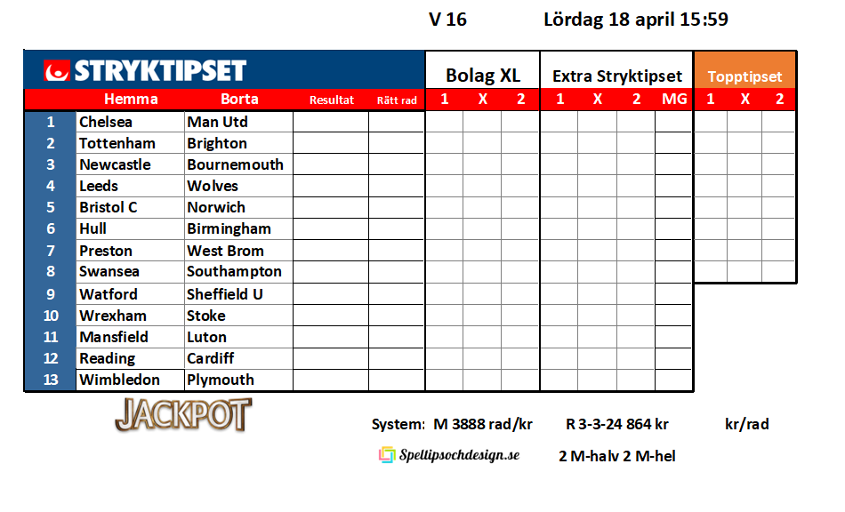 Vecka 16 Spelstopp: lördag 18 april kl 15:59