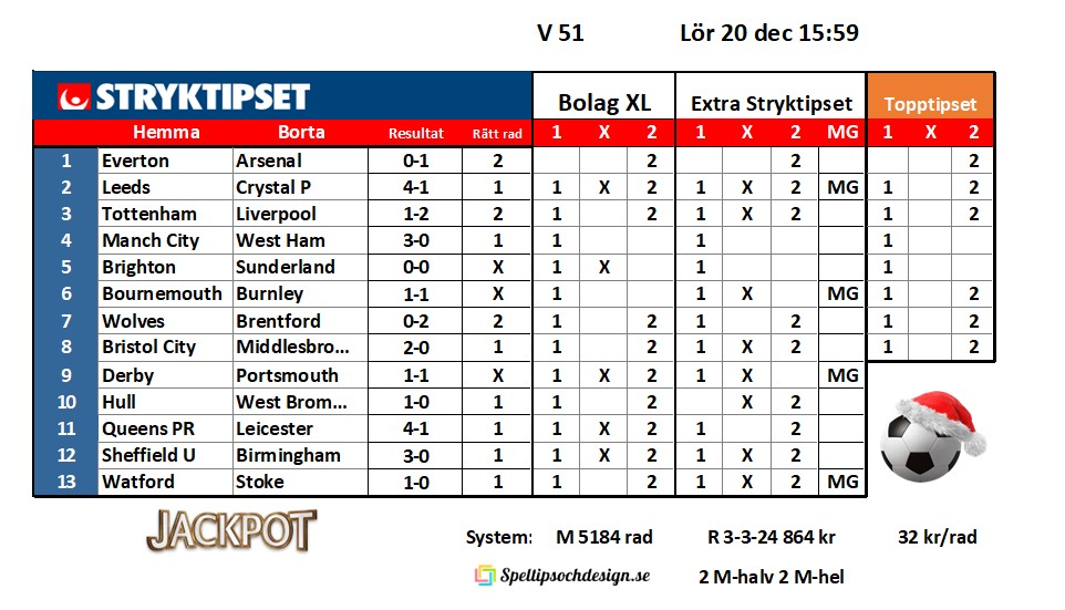 Statistikvinnaren: 10. Hull-West Bromwich 1-2-3 (1-1-1) går fram som en ångvält men nu kommer "farbror torsk" på besök. Gästerna ska kunna mycket bättre än de visat så här långt. En seger på de sex senaste mötena och nu får hemmalaget det jobbigt. Gardera 1 2 som ger grön bock.