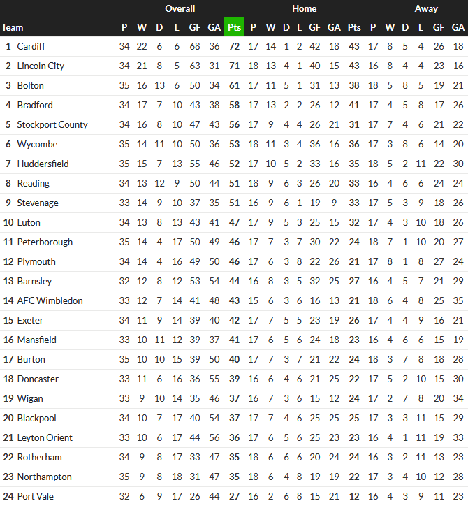 Bolton ligger på 3:e plats med 61 poäng efter 35 matcher. Laget har nyligen visat stark form med en 5–1-seger borta mot Exeter City i slutet av februari.